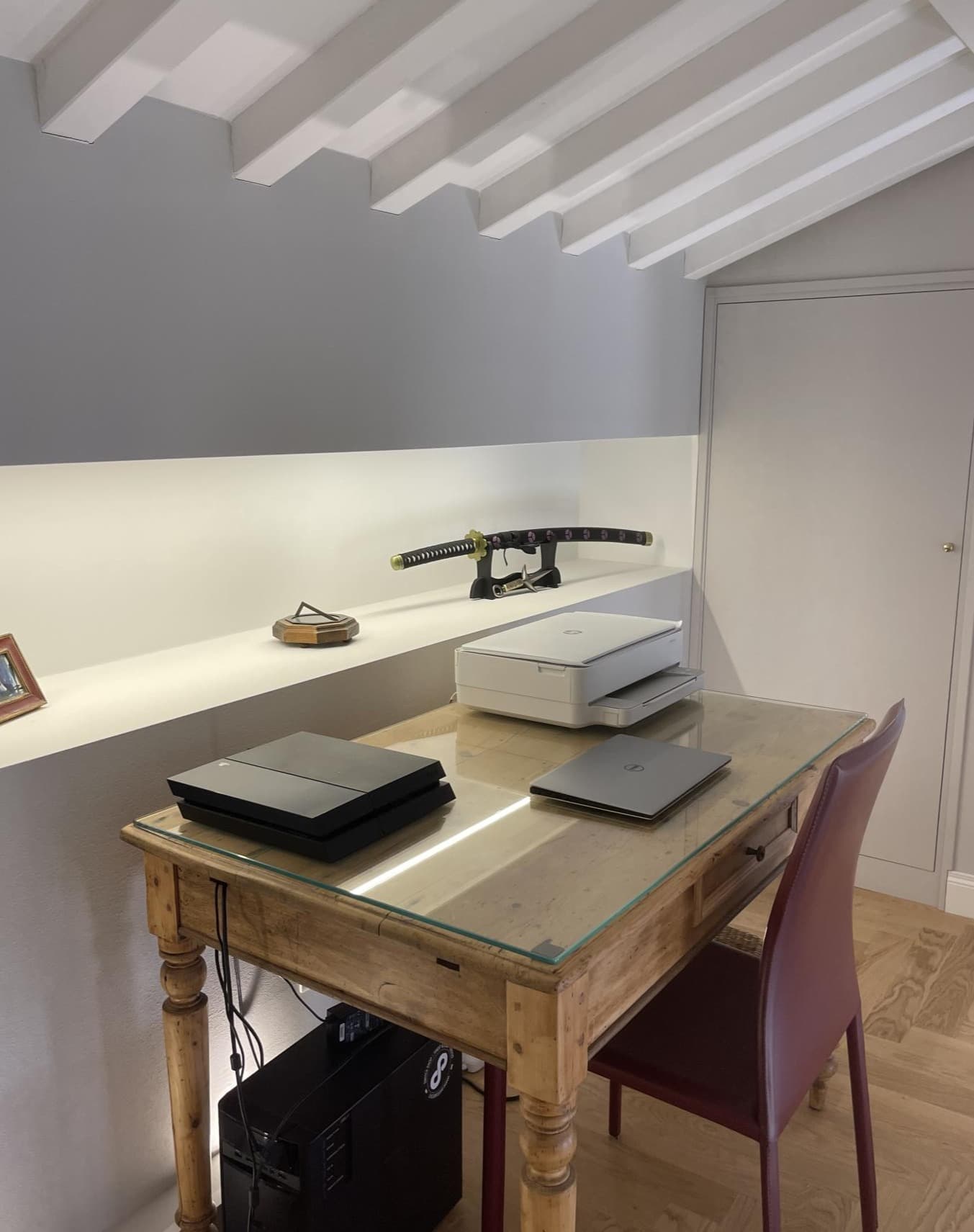 Il rifacimento di una parte del solaio ci ha permesso di ricavare un ulteriore spazio nella soffitta prima inutilizzata, mantenendo una sezione a doppio volume per la stessa zona giorno.