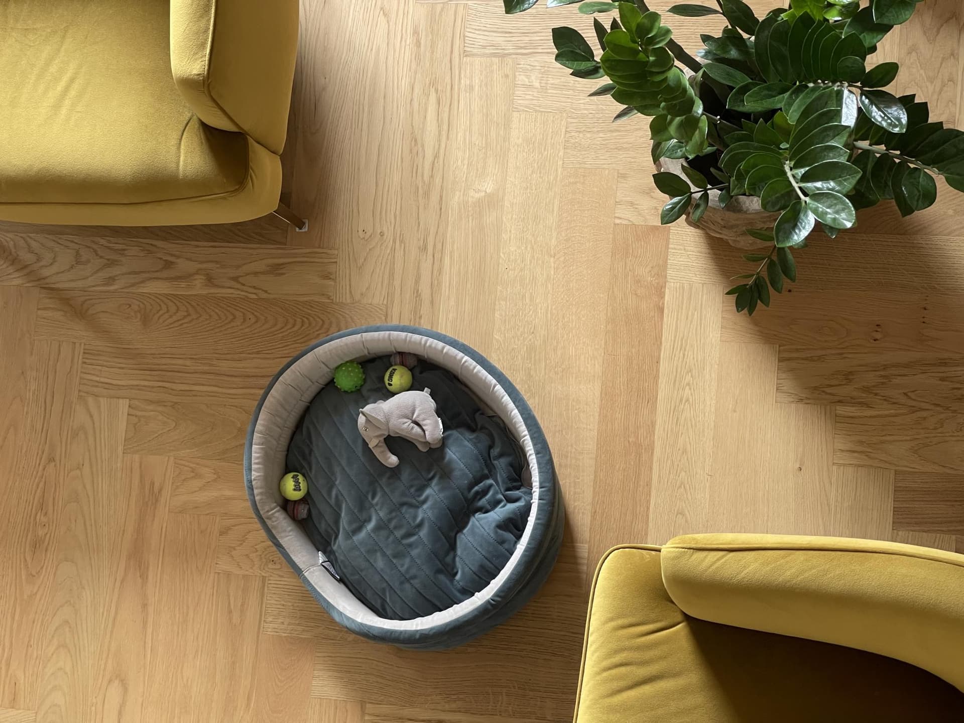 Il parquet, il soffitto a travi in legno a vista verniciato e i colori chiari delle tinteggiature creano un’atmosfera avvolgente e rilassante.