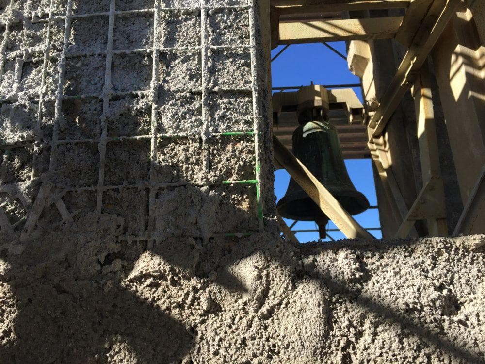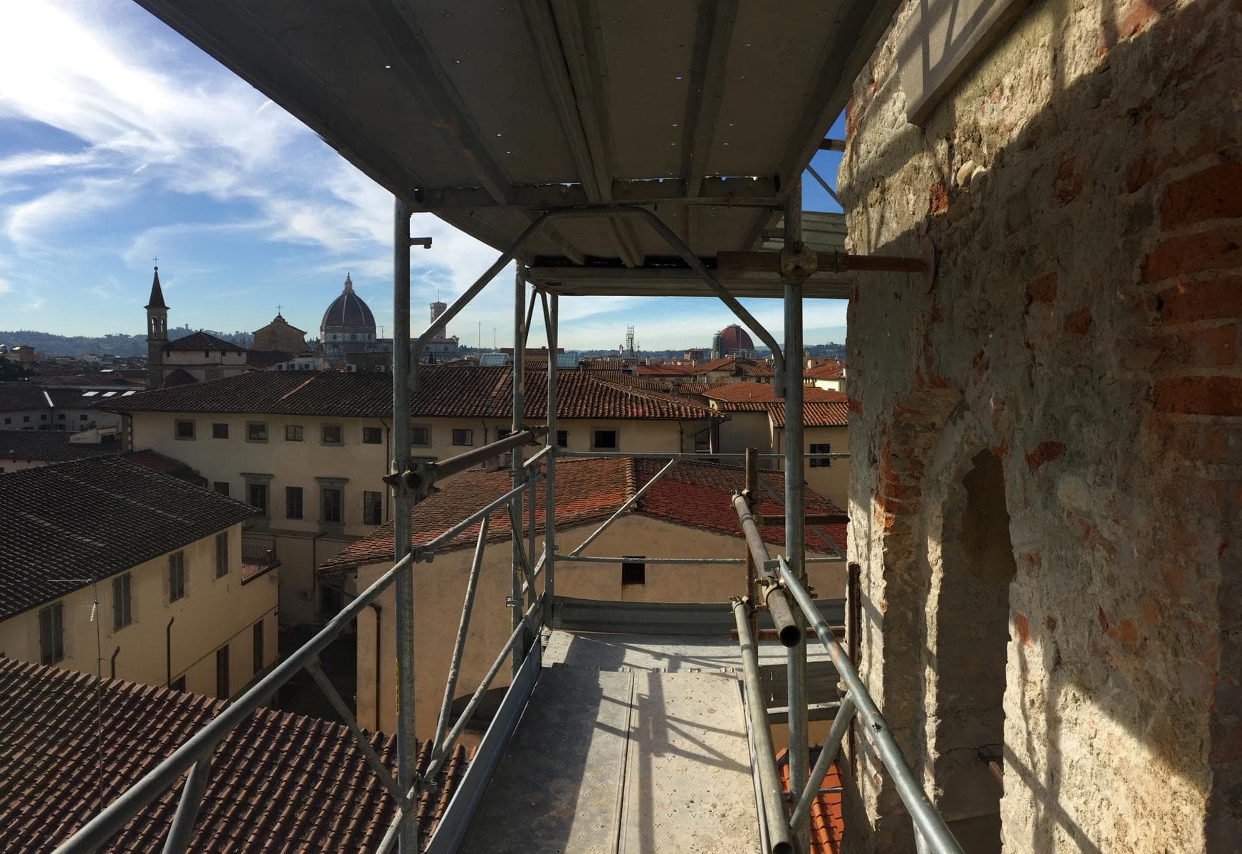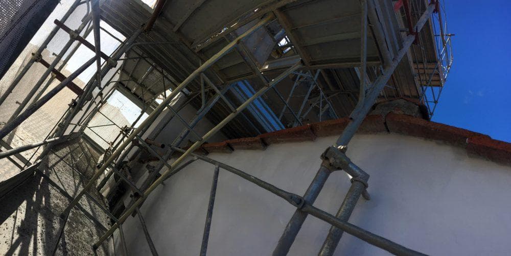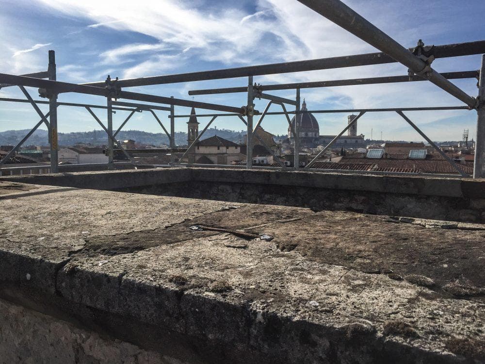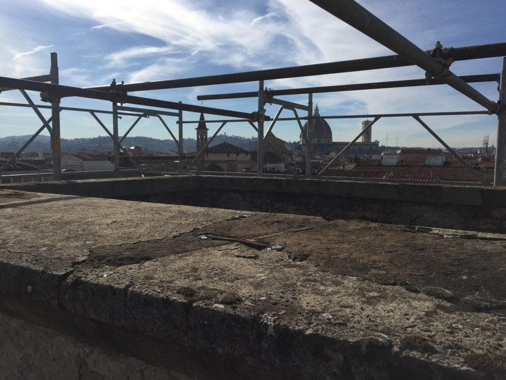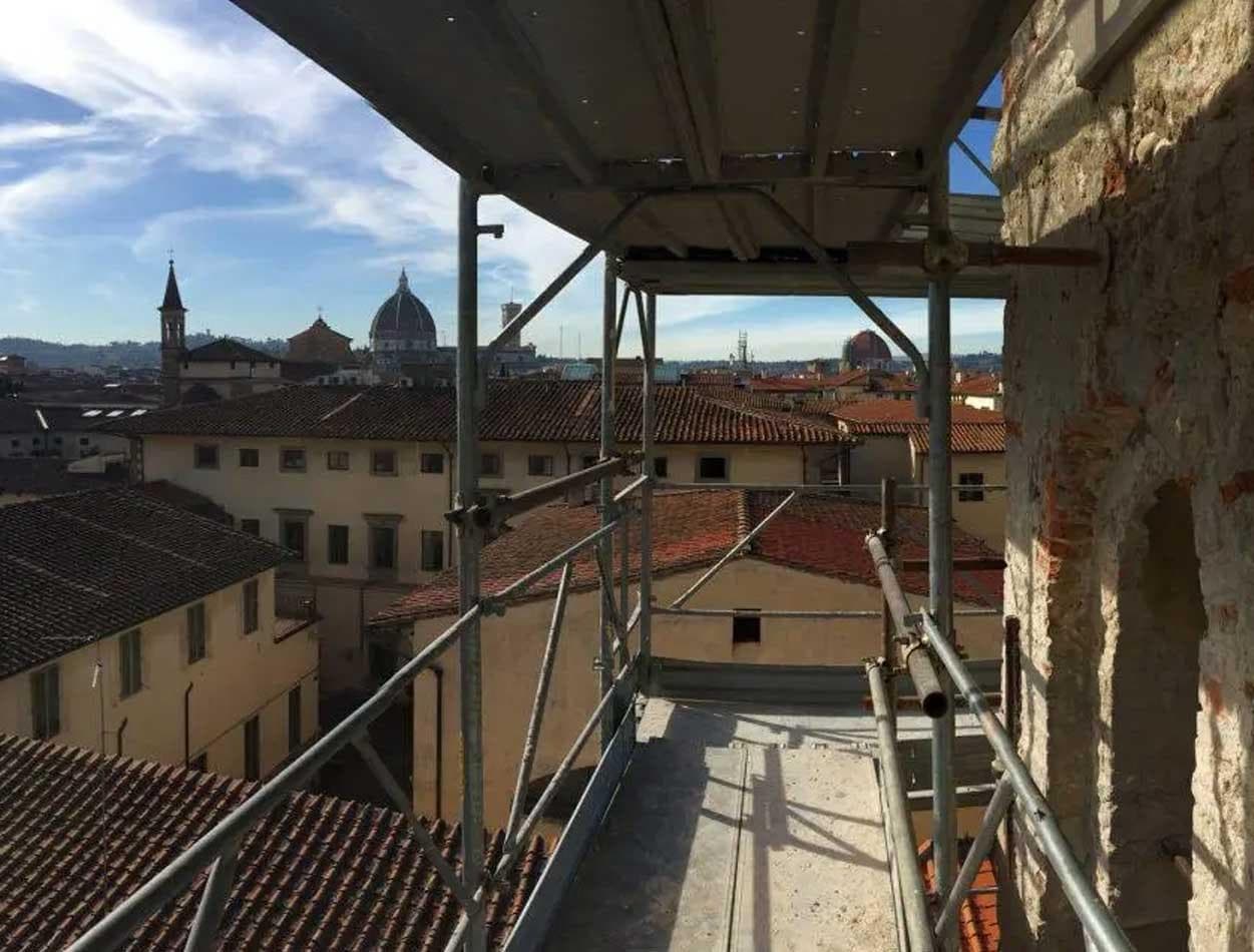 La particolare conformazione dell’edificio, ha reso necessario poggiare alcune parti di ponteggio sulle coperture della chiesa.