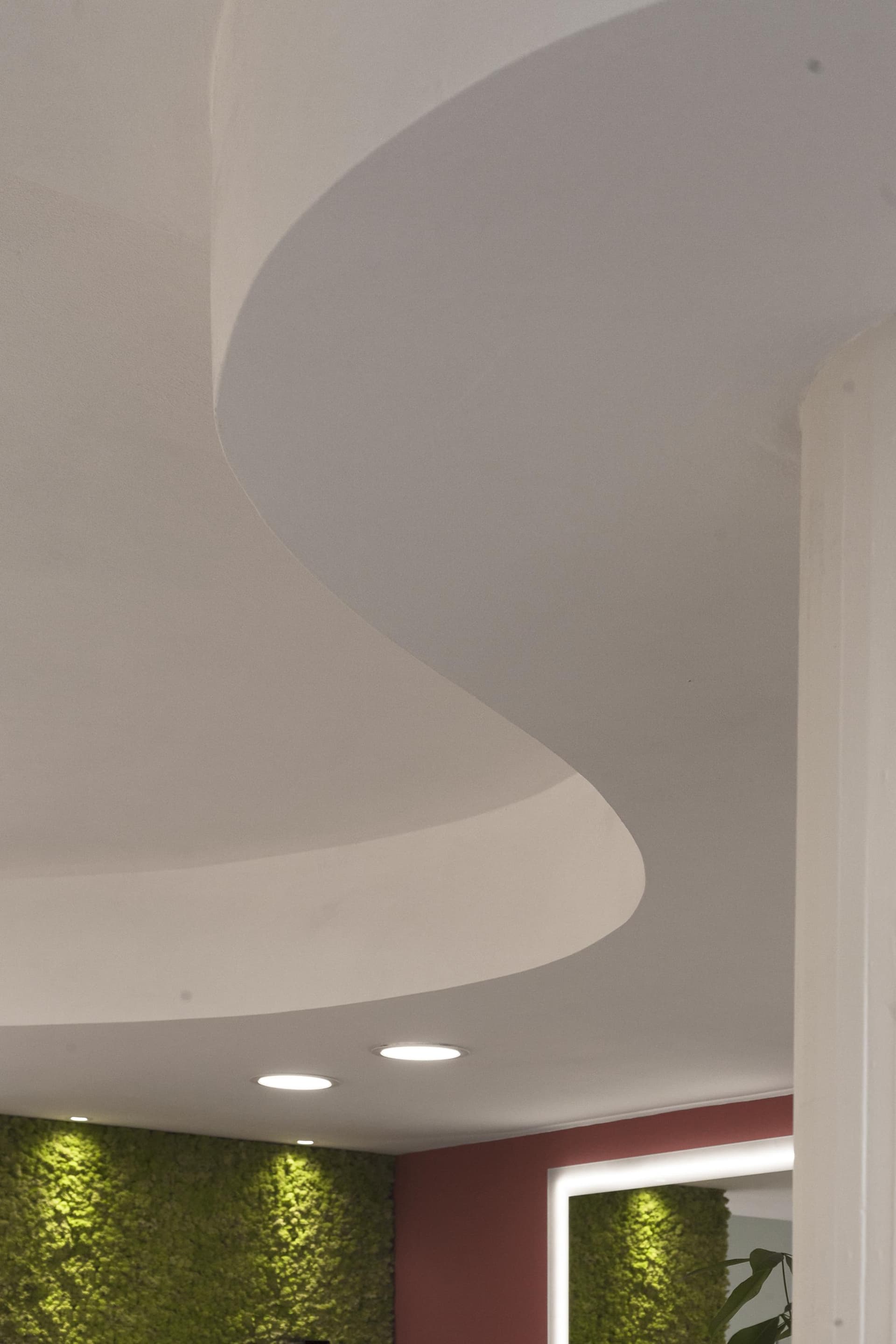 I soffitti, necessariamente in cartongesso per alloggiare gli impianti, seguono forme sinuose per favorire un flusso lento, costante e positivo di energie all’interno del salone.