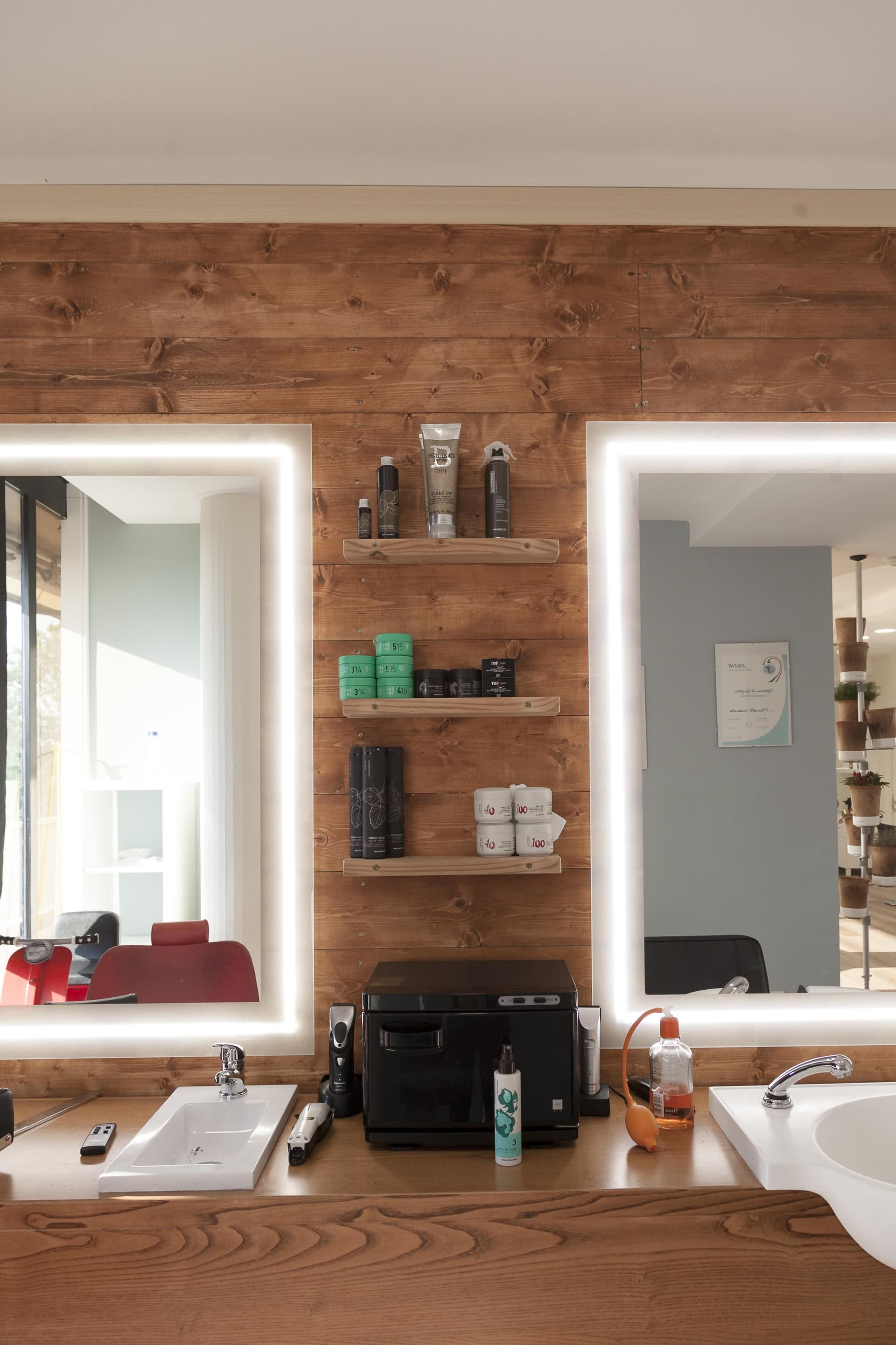 Abbiamo scelto come colore di base per tutto il locale l'avorio, un colore chiaro ma caldo e avvolgente, con alcuni accenti per caratterizzare alcune zone: il rosso vinaccia per la postazione VIP, il verde del lichene stabilizzato come focus visibile dall’ingresso e il celeste-grigio nel Barber Shop.