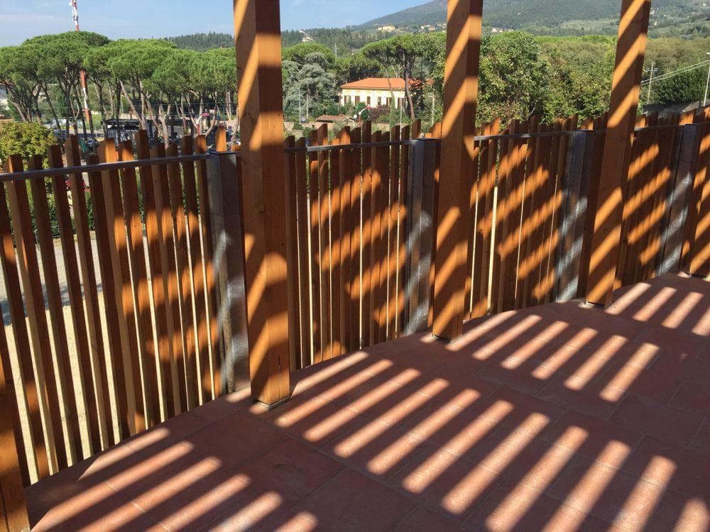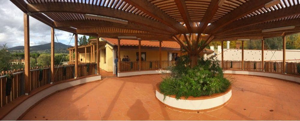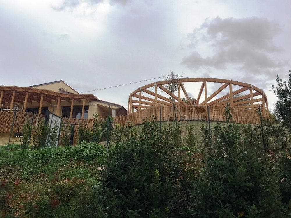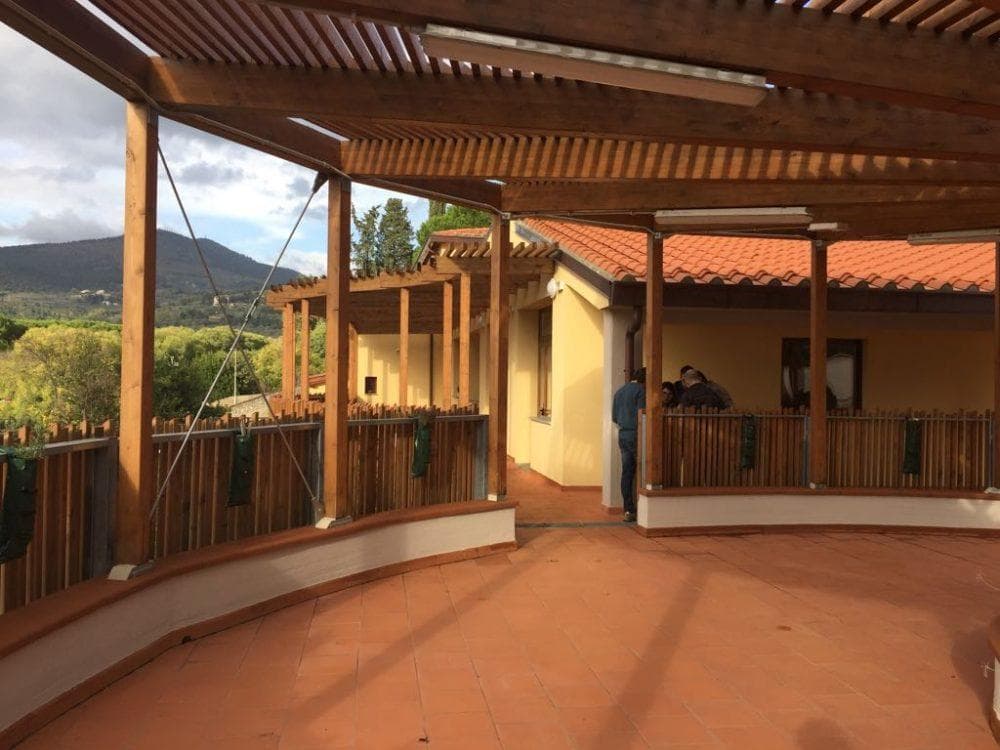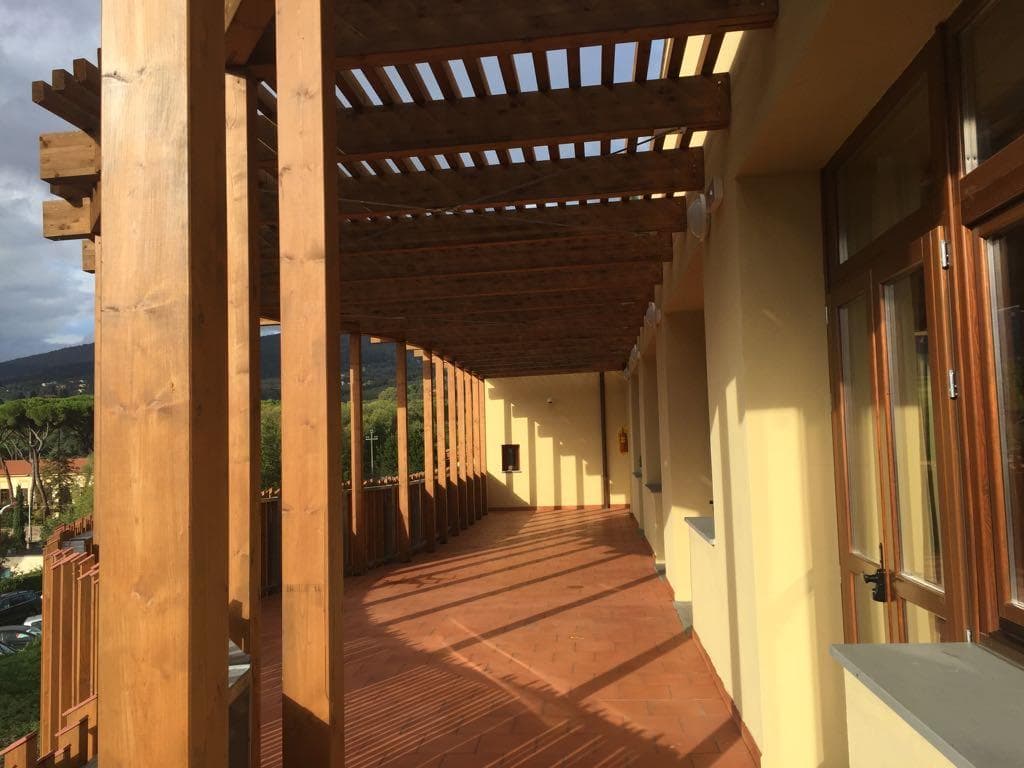 L’intervento prevedeva sia la Patrimonio Esistente del vecchio edificio, che la realizzazione di un nuovo corpo adiacente al preesistente, realizzato con strutture in cemento armato, secondo le normative antisismiche esistenti. Gli spazi esterni sono caratterizzati da un ampio frangisole circolare in legno.